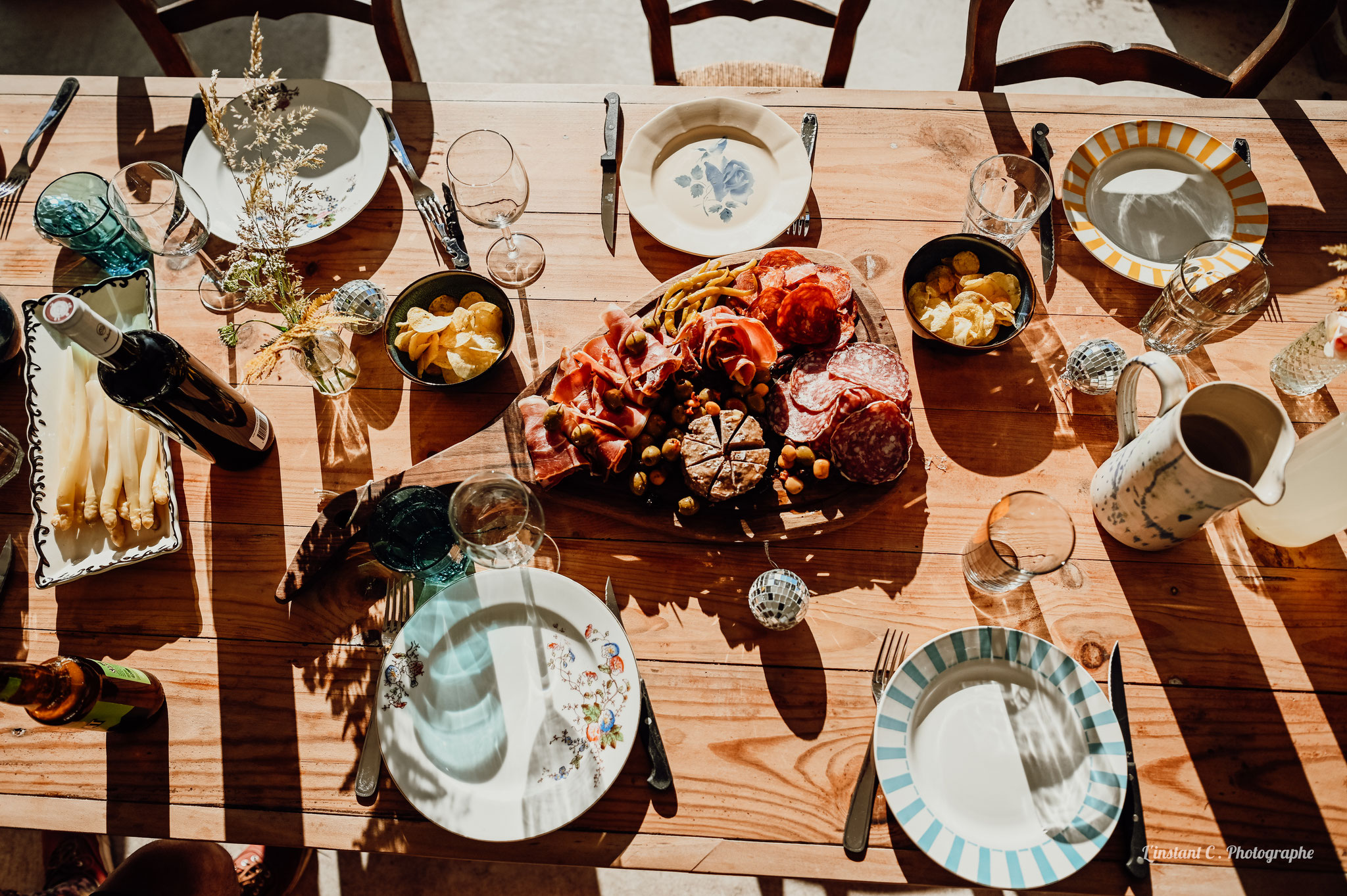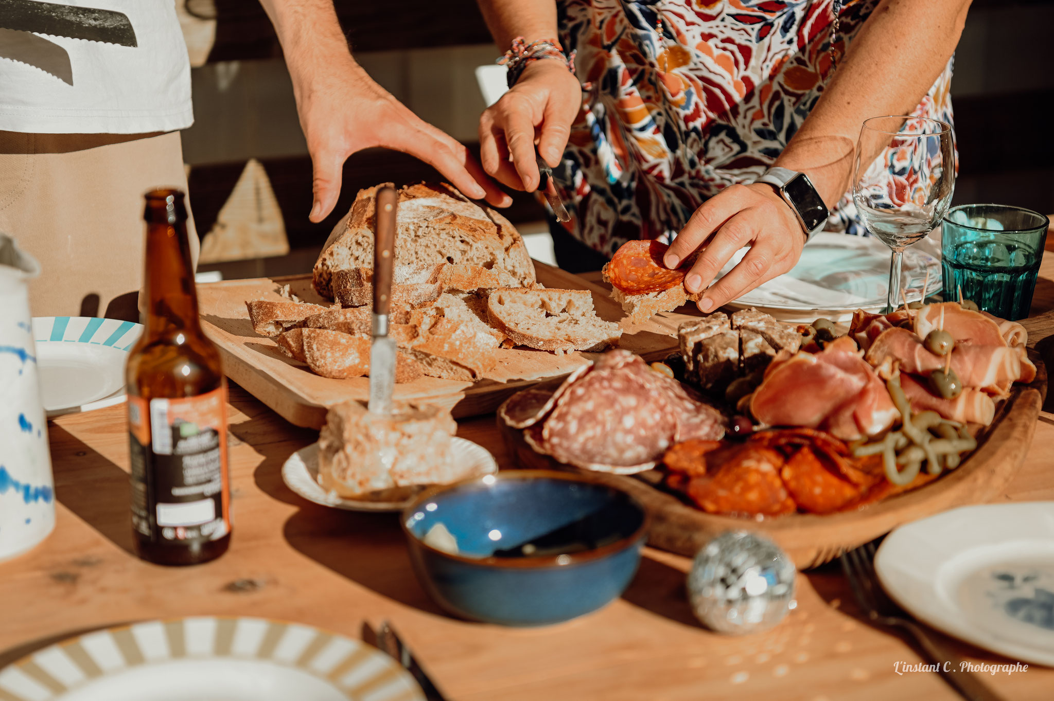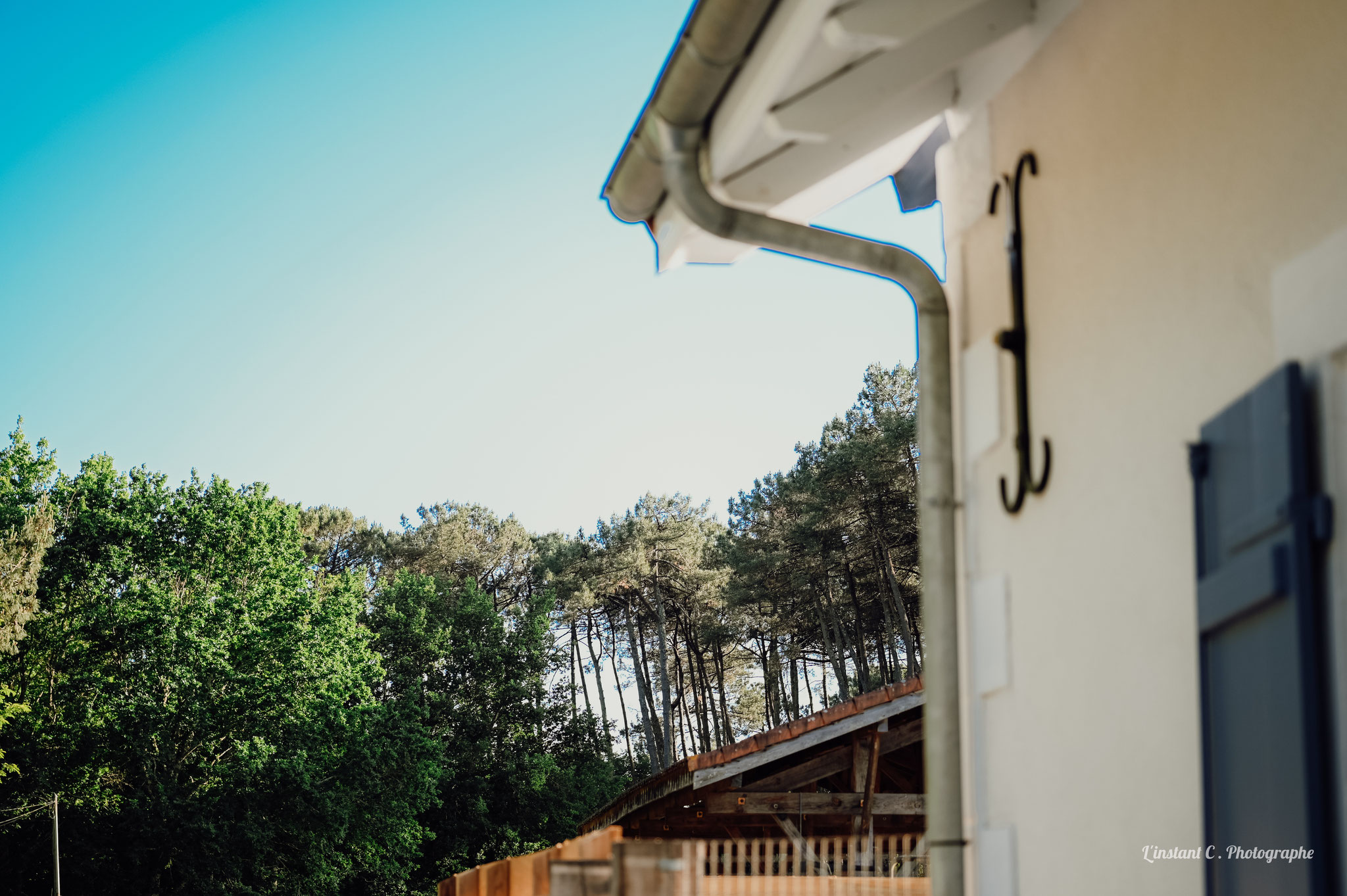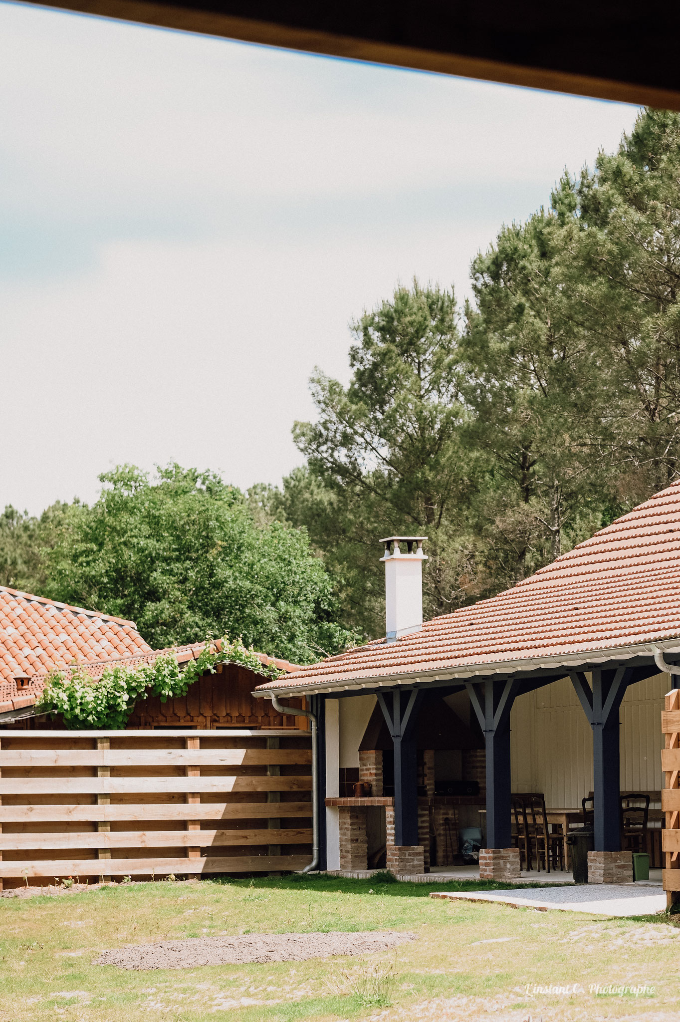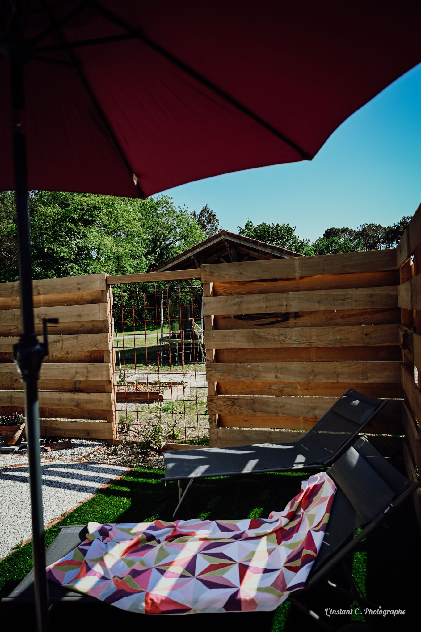 Côté soleil couchant, large terrasse couverte avec table, chaises et bancs coffre à proximité du barbecue et de la plancha.