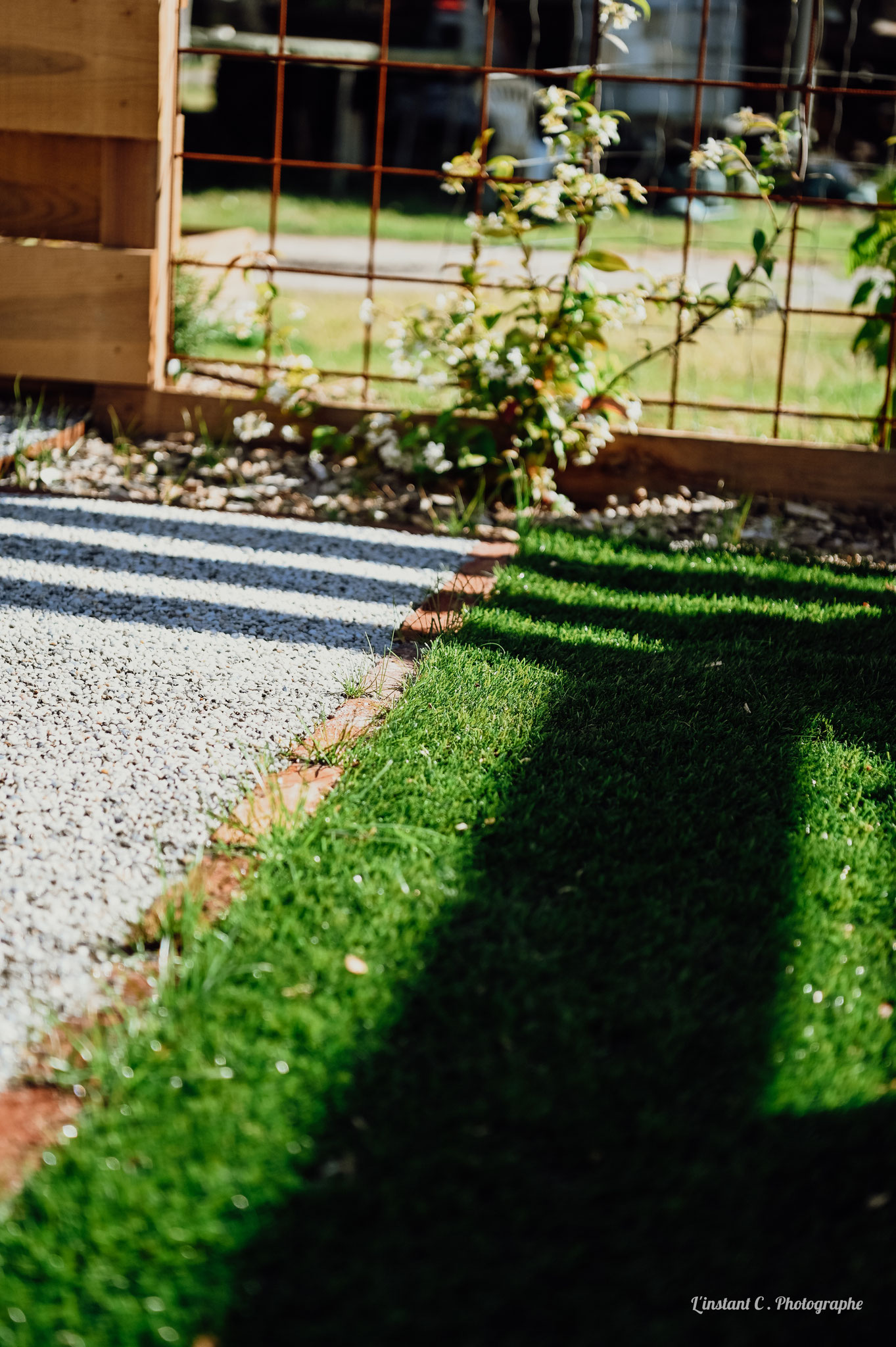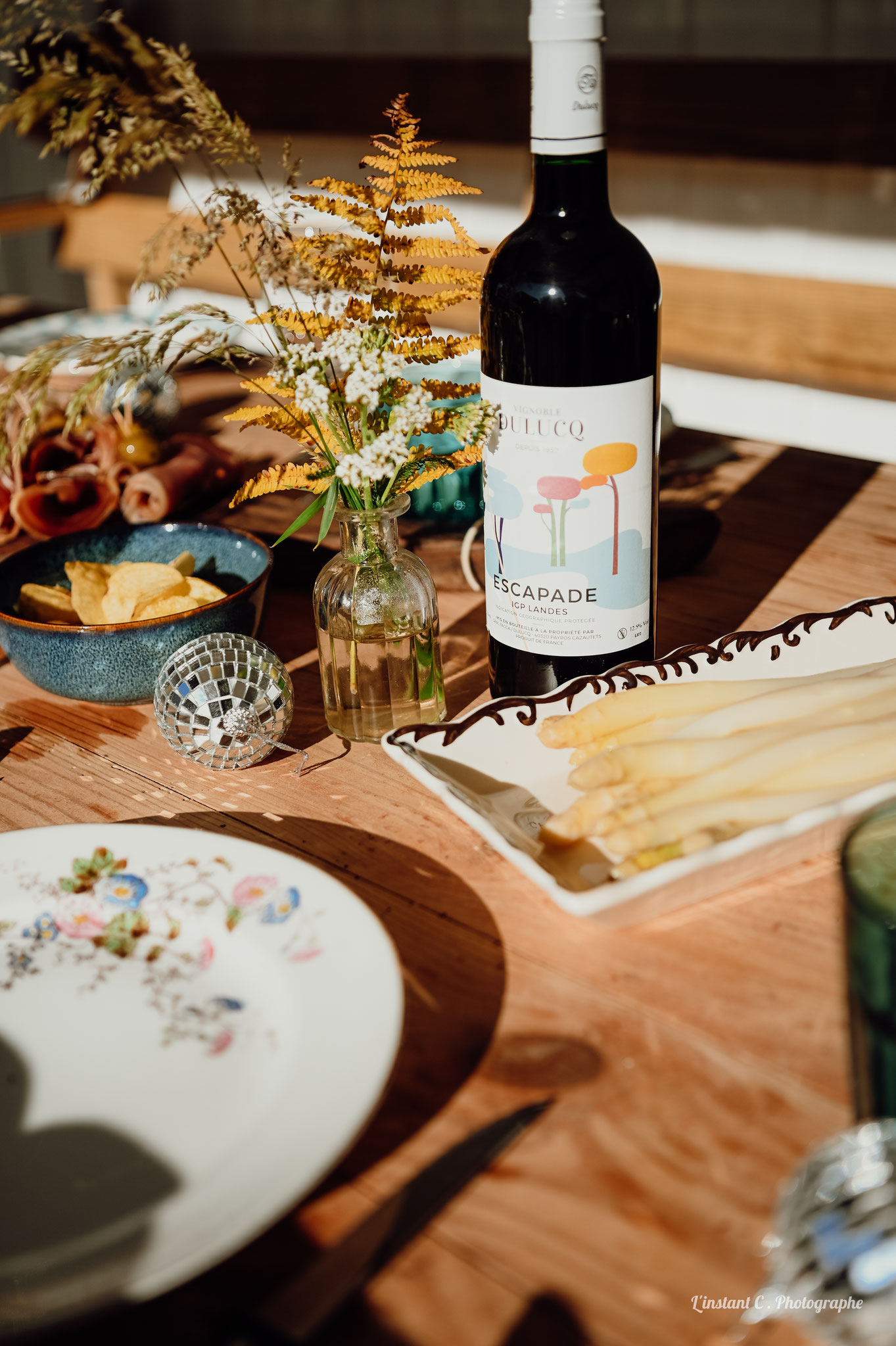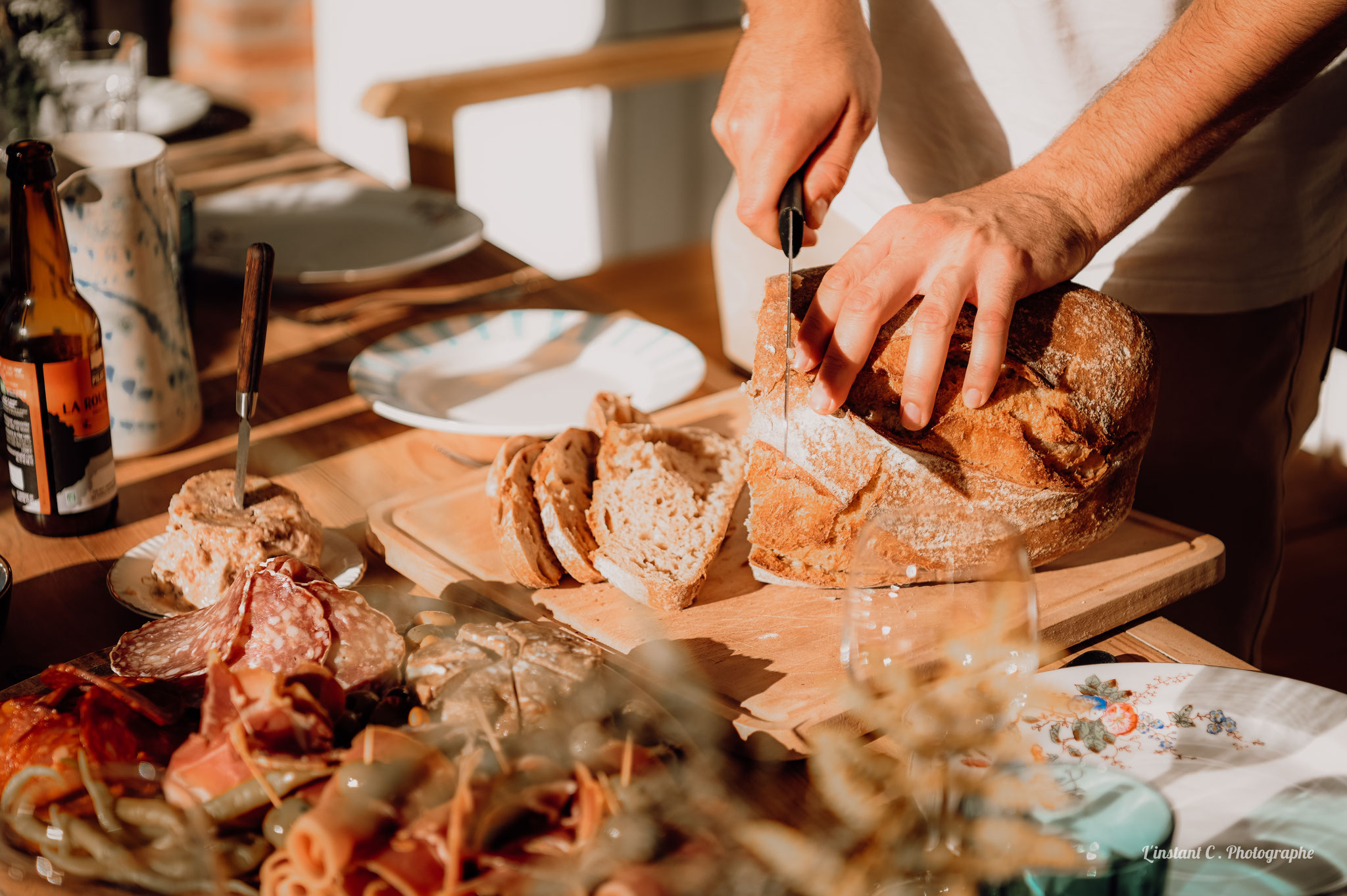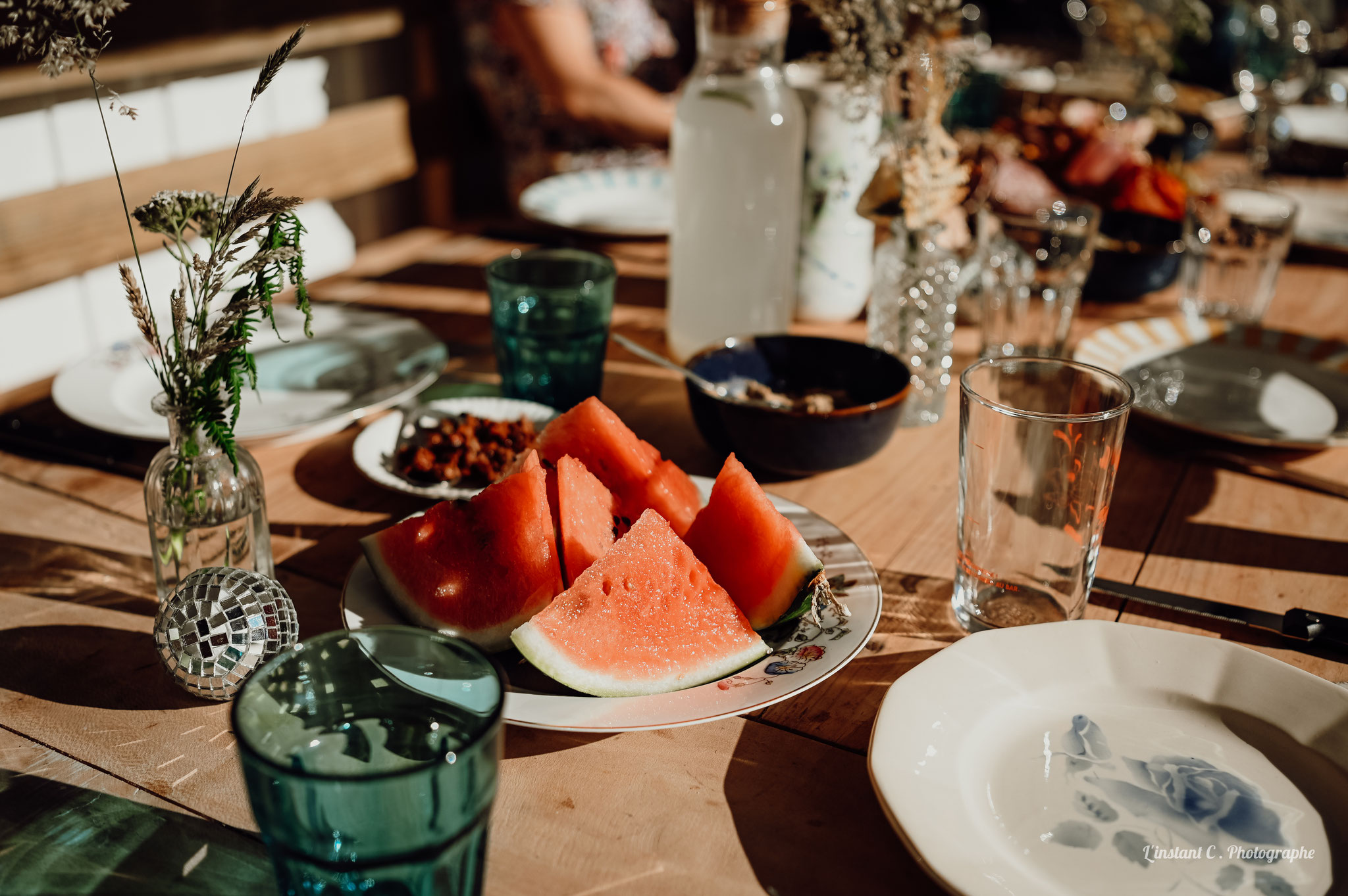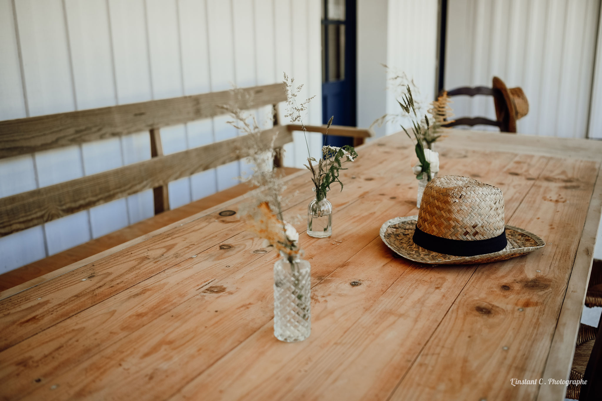 Côté soleil couchant, large terrasse couverte avec table, chaises et bancs coffre à proximité du barbecue et de la plancha.