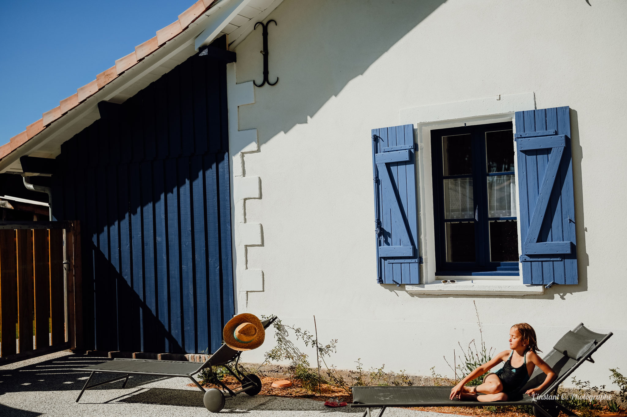 Terrasse aménagée côté sud ouvrant sur la piscine avec bains de soleil et parasol.