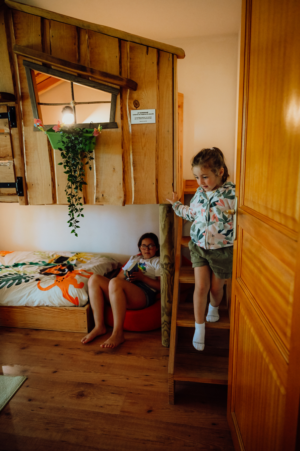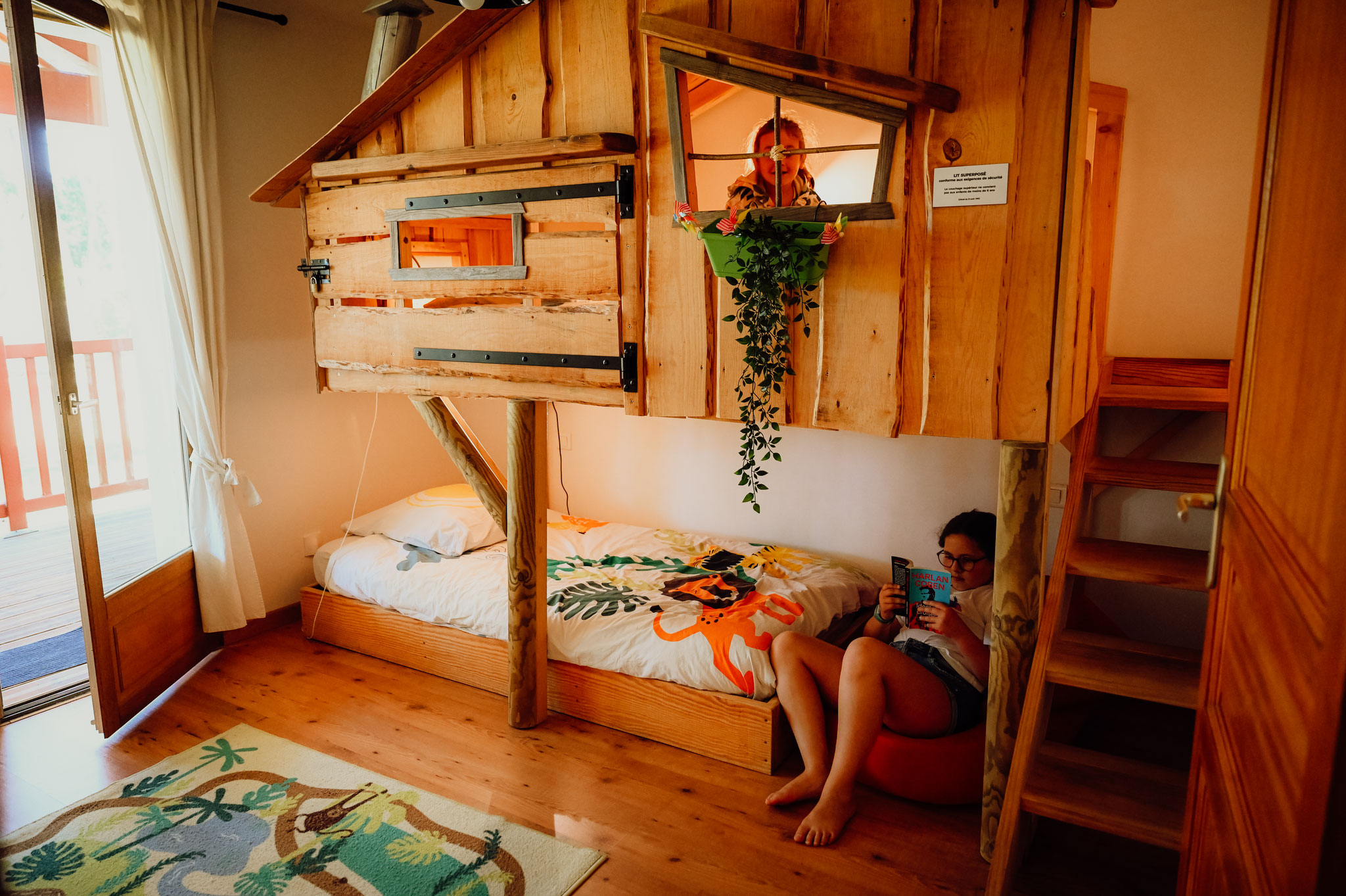 Une Chambre Parentale avec lit en 160, et une Chambre Enfants aménagée avec Cabane sur pilotis en pin des Landes avec 2 lits en 90.