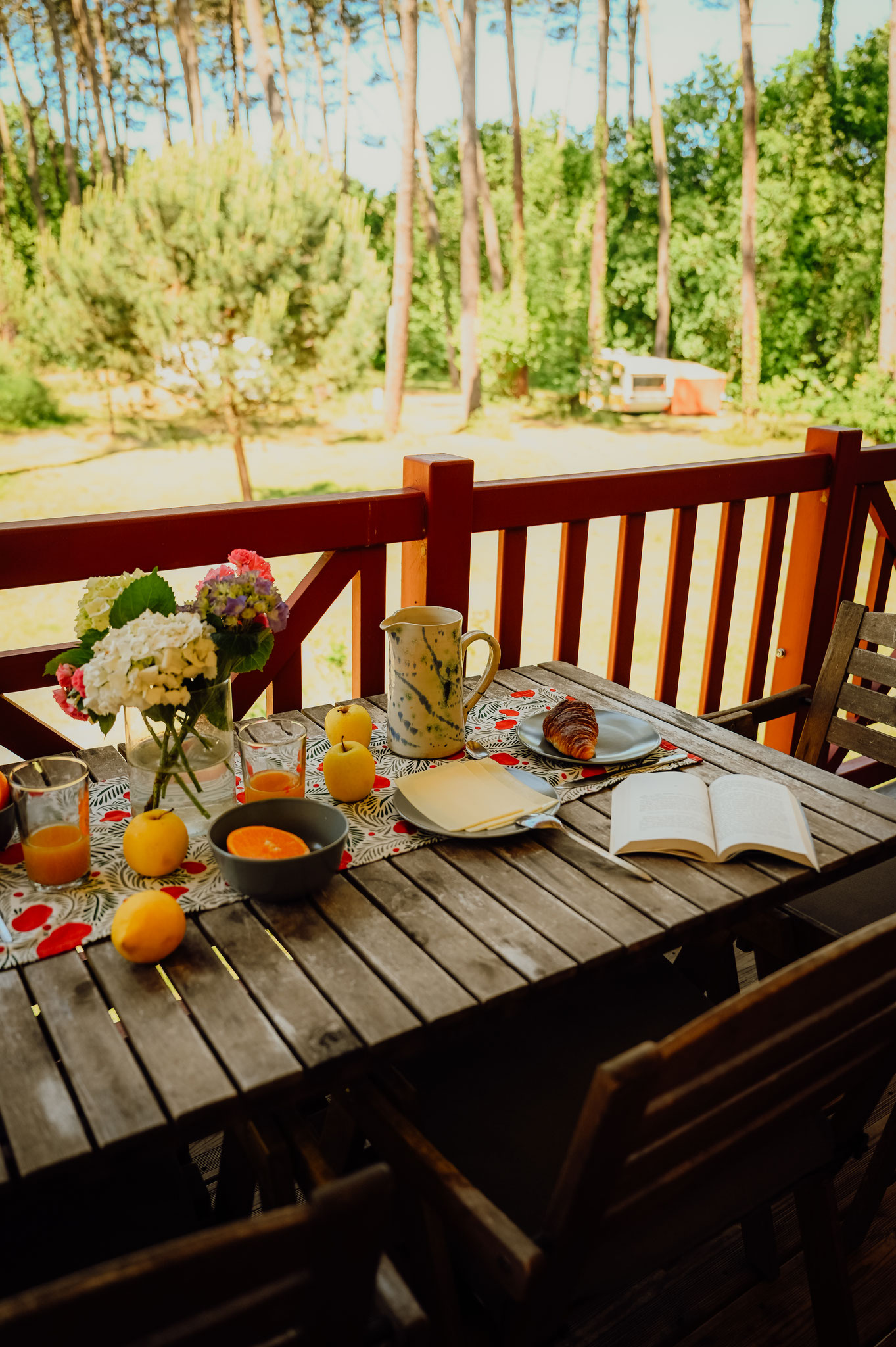 Terrasse couverte à l'étage de 25 m² face à la forêt de pins et au coucher de soleil ; avec salon de jardin en bois.